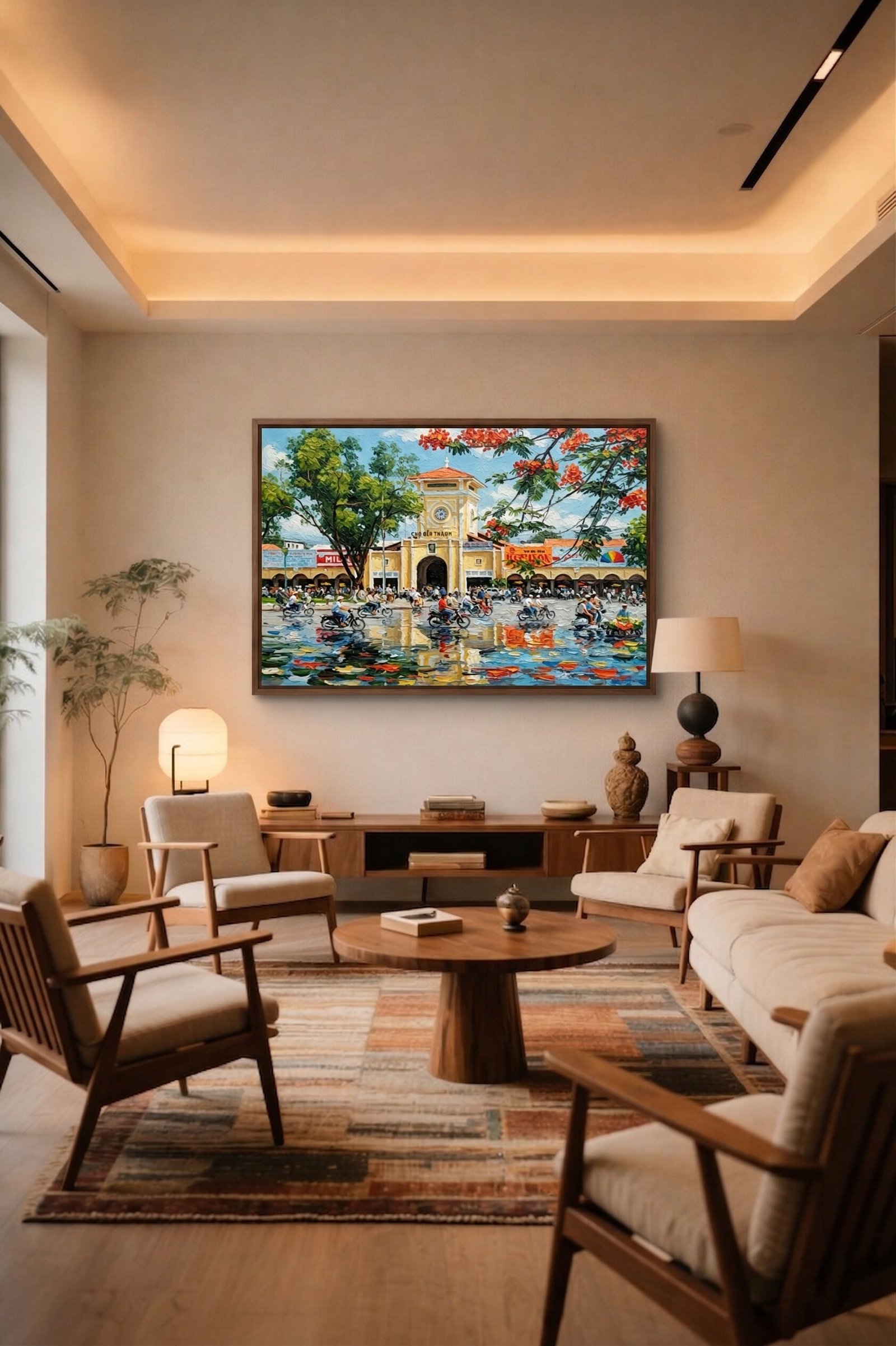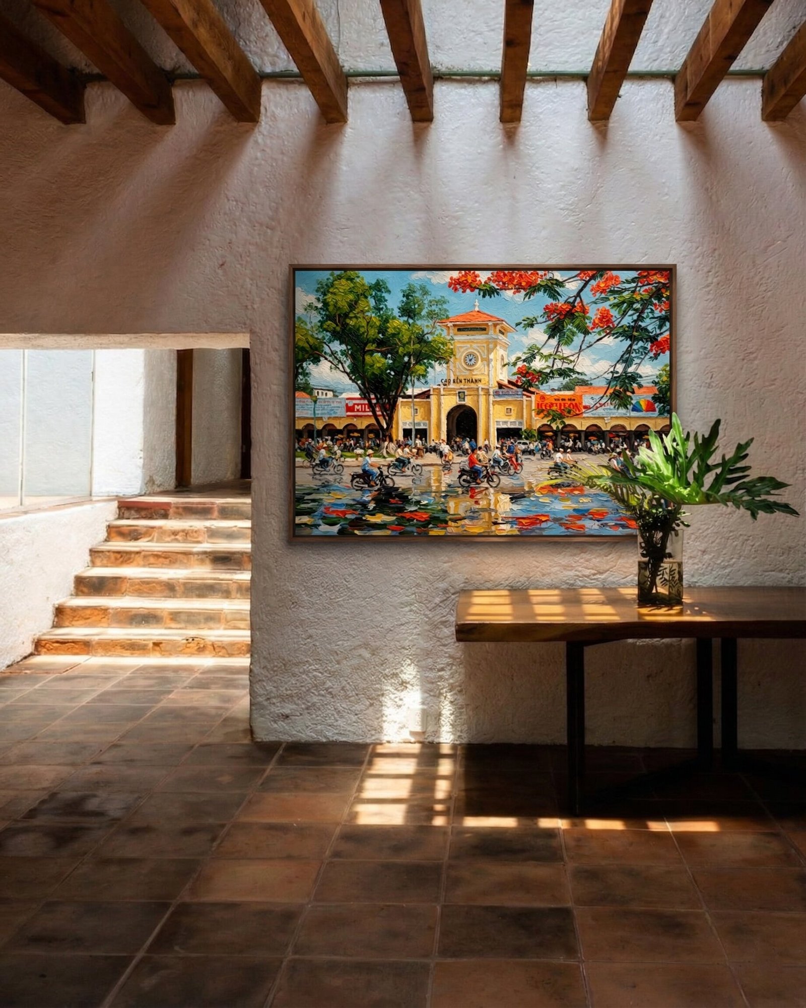 Heißen Sie die helle Energie und den nostalgischen Charme Ho-Chi-Minh-Stadts willkommen. Dieses unglaublich lebhafte Bến-Thành-Markt-Gemälde zeigt das berühmteste Wahrzeichen nach einem erfrischenden Sommerregen und verleiht Ihrem Raum brillante Farben und unglaubliche Textur.