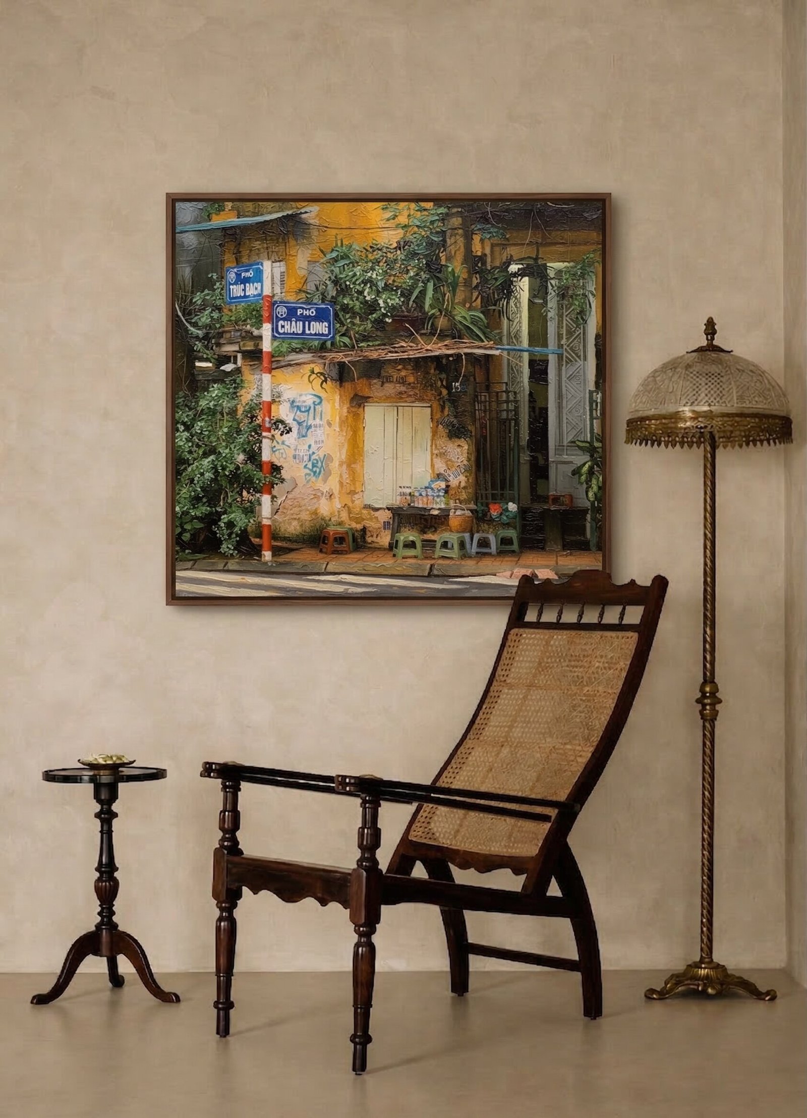 The true emotional core of this painting, however, lies at the ground level, nestled quietly against the weathered wall. Here, the artist has meticulously captured a classic trà đá vỉa hè—the beloved, ubiquitous Vietnamese street tea stall. A small, simple wooden table holds a collection of glass bottles and jars, patiently waiting for the daily patrons. Clustered around it are the iconic, tiny plastic stools in nostalgic shades of green and brown, resting quietly on the tiled sidewalk. This humble setup is the absolute heartbeat of neighborhood life in Hanoi. For overseas Vietnamese or frequent travelers, the sight of these small plastic stools evokes a powerful wave of nostalgia and a deep, comforting sense of home.