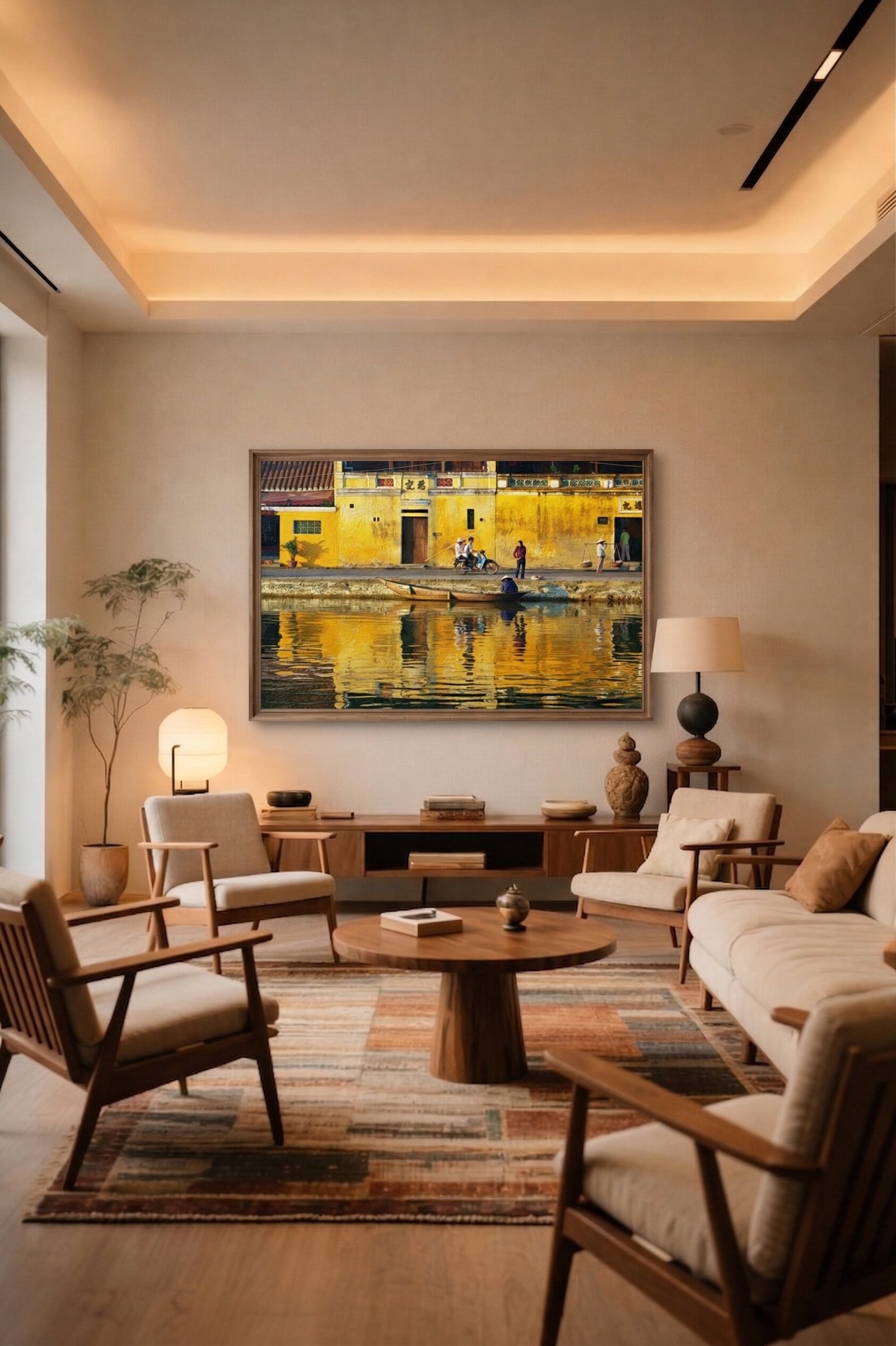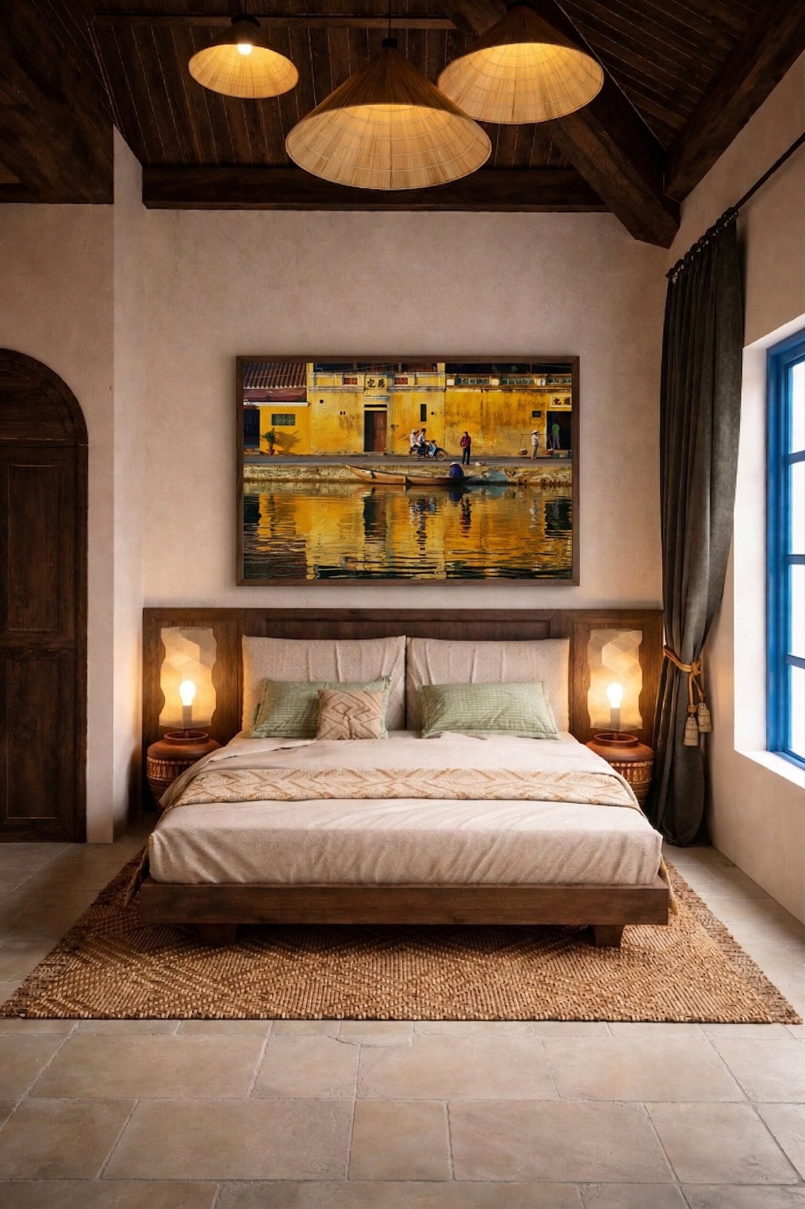 Transformez votre espace de vie avec la beauté radieuse du centre du Vietnam. Cette lumineuse œuvre d’art de Hoi An capture magnifiquement une scène riveraine vibrante et paisible. Elle sert de pièce maîtresse visuelle époustouflante qui apportera immédiatement chaleur et profondeur culturelle à votre intérieur.