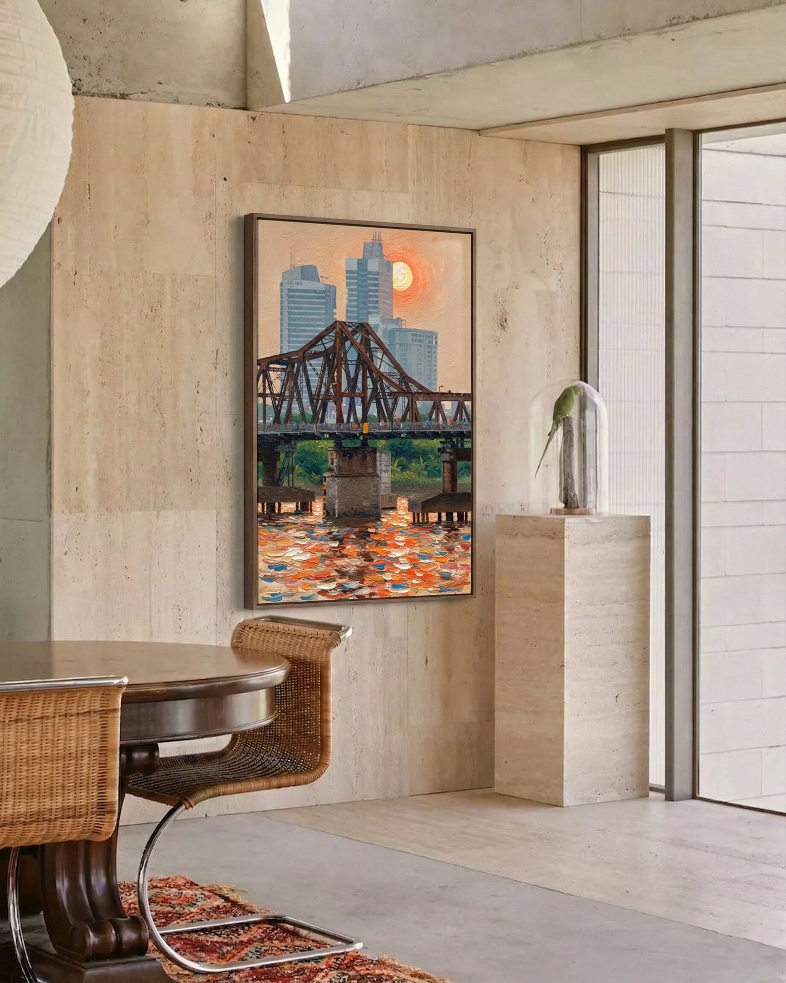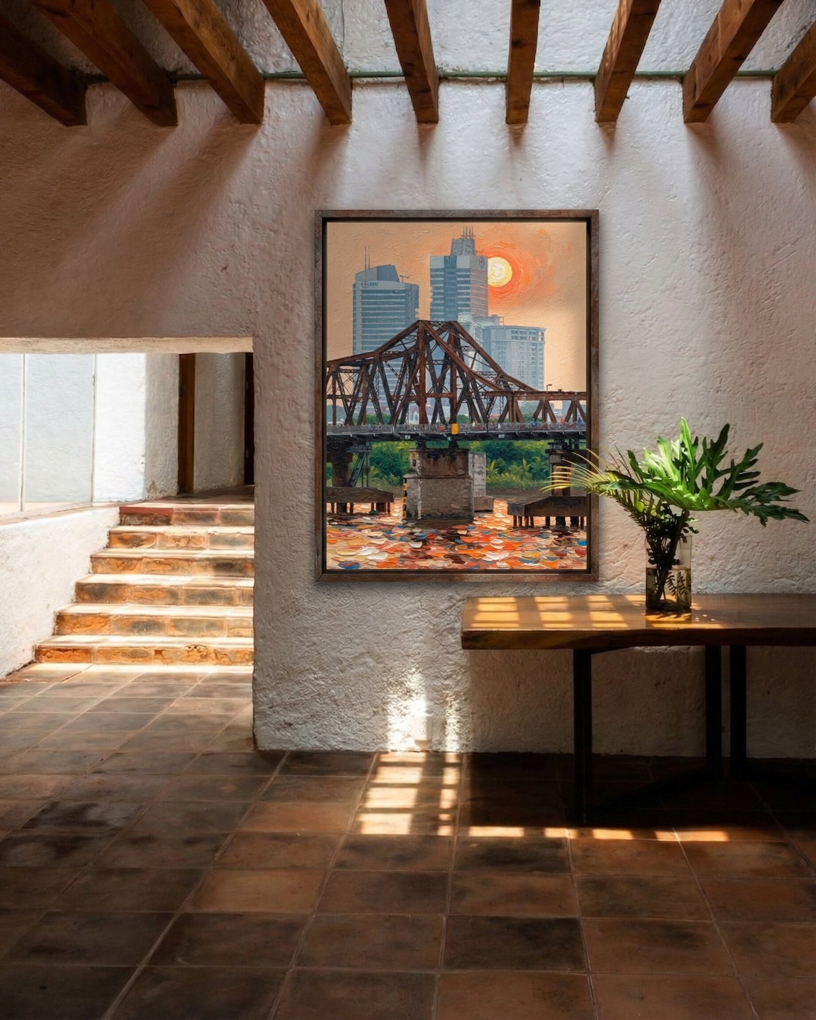 ハノイのダイナミックで歴史的なエネルギーをご自宅に。この印象的なロンビエン橋の絵画は、夕暮れ時の首都の息をのむような眺望を提供します。都会的な個性と質感をインテリアに即座に加える力強いビジュアルの主役です。