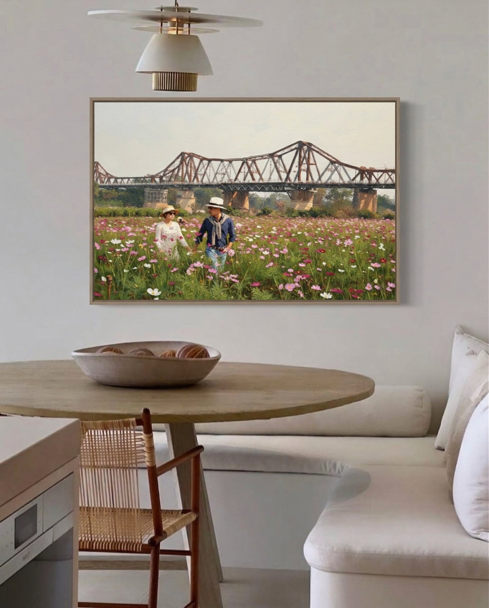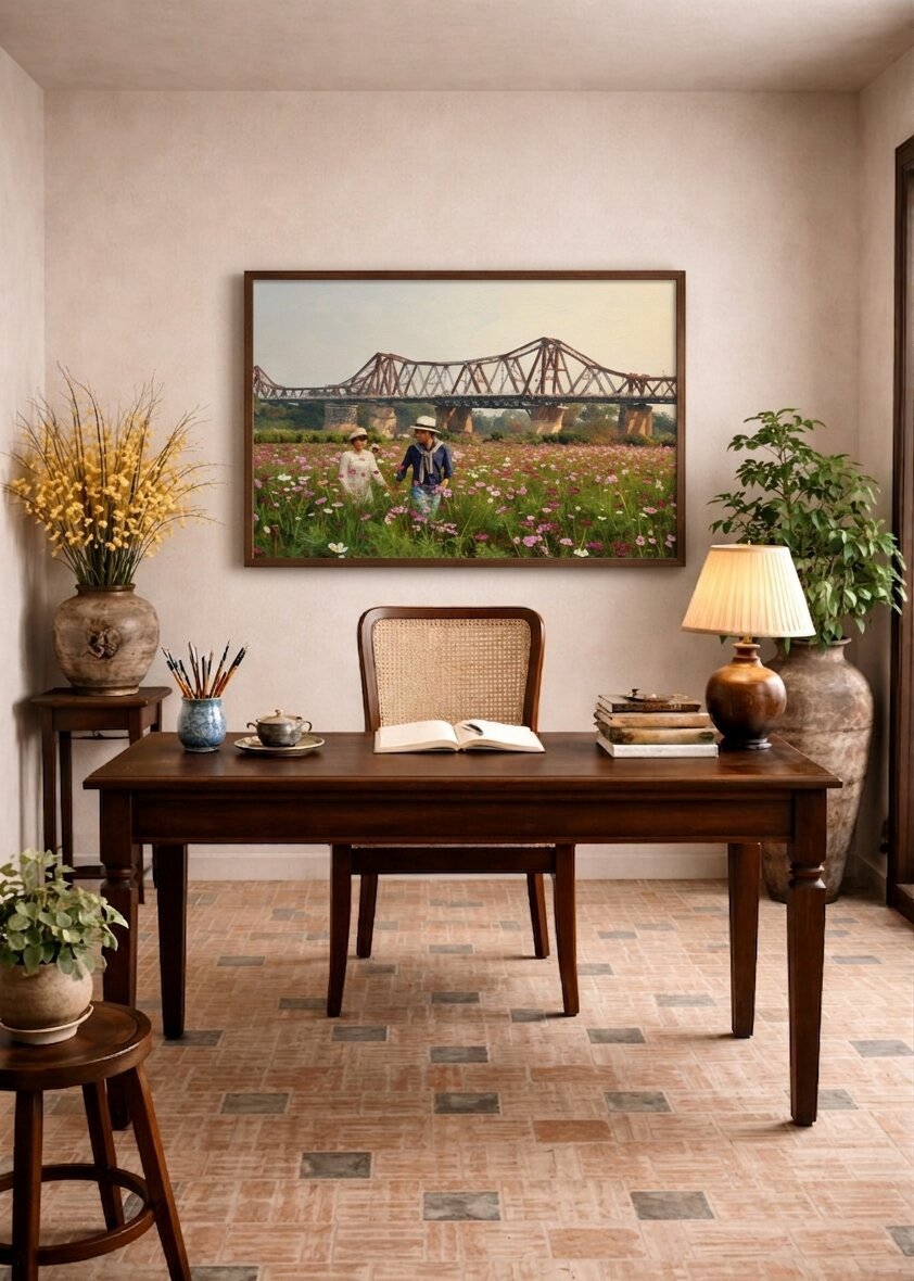 Bring the romantic charm and historic beauty of Hanoi into your living space. This enchanting Long Bien Bridge Painting beautifully captures a picturesque afternoon along the banks of the Red River. It serves as a breathtaking visual centerpiece that will immediately add vibrant color, rich history, and incredible texture to your interior home decor.