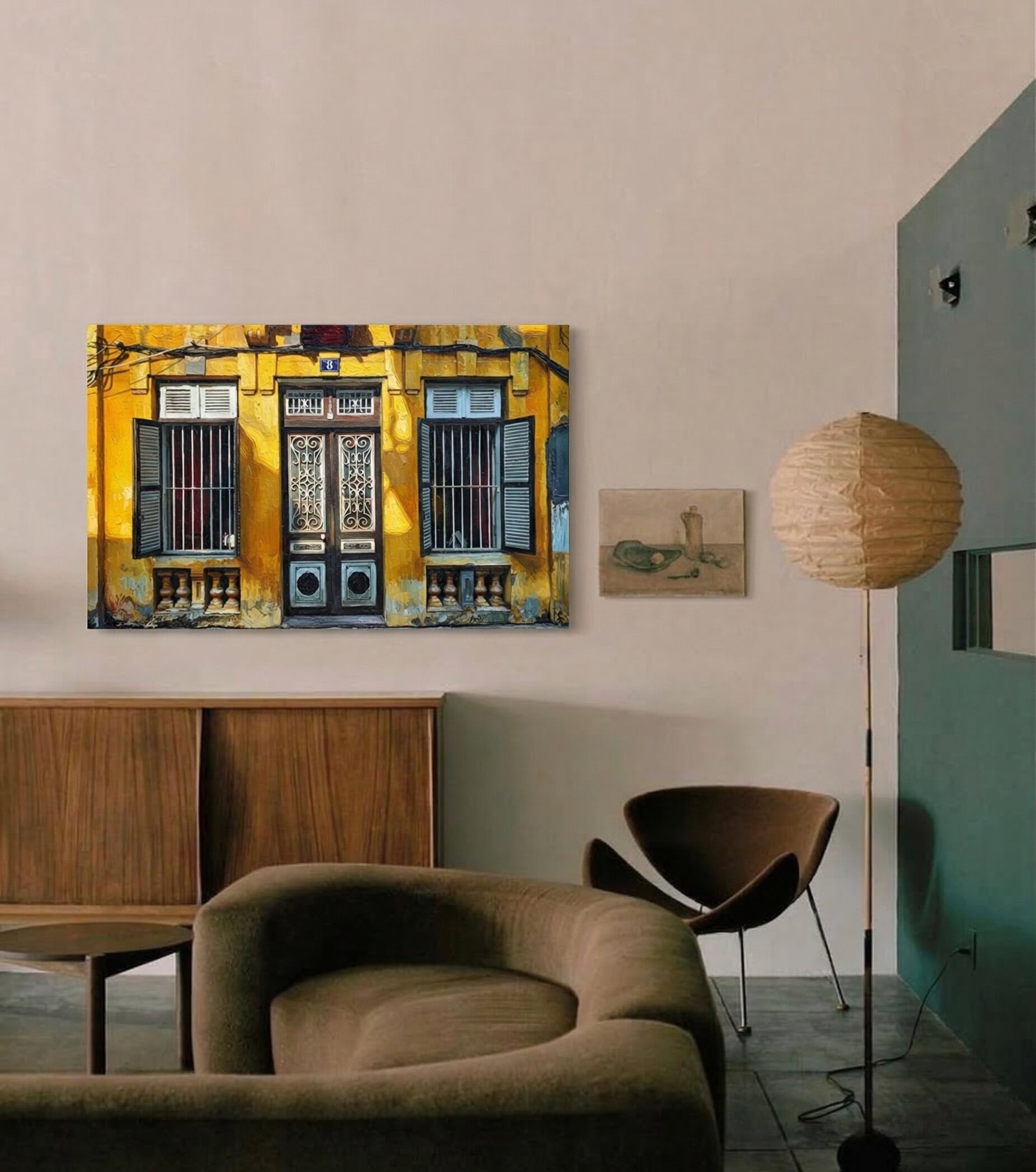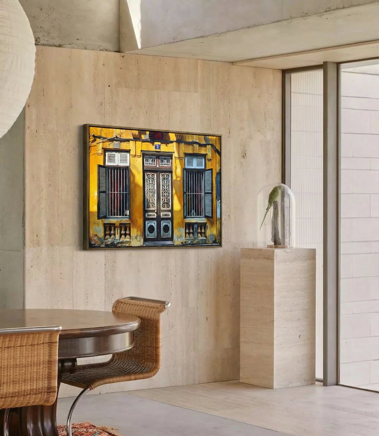 A masterful and highly expressive impasto technique brings this nostalgic architectural portrait to life. Thick layers of premium oil paint are deliberately applied with confident palette knife strokes. This specific artistic method creates a remarkably tactile, three-dimensional surface across the entire canvas. You can clearly see and visibly feel the rich texture in the rough, peeling yellow walls, the sturdy wood grain of the shutters, and the intricate metalwork.