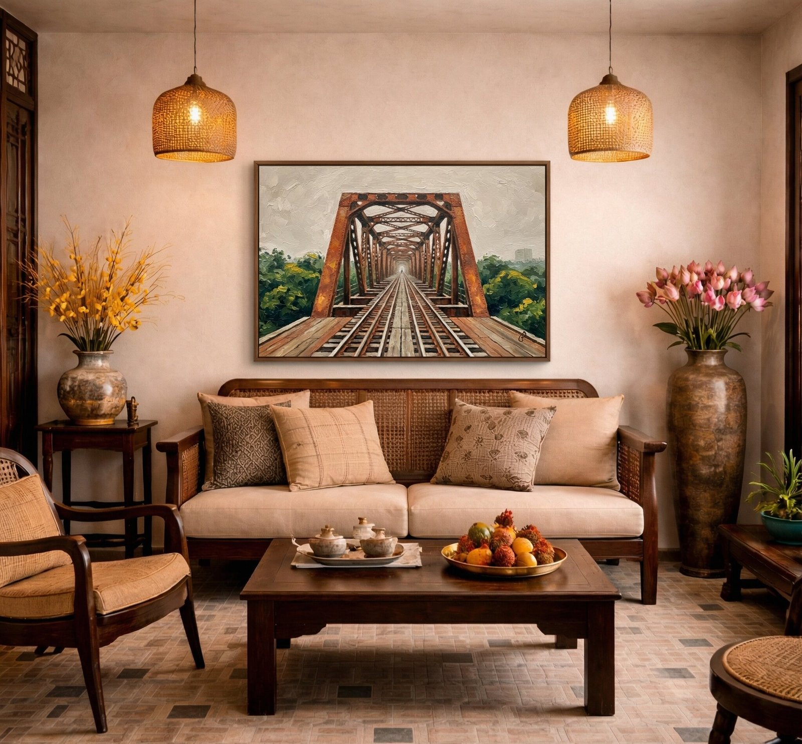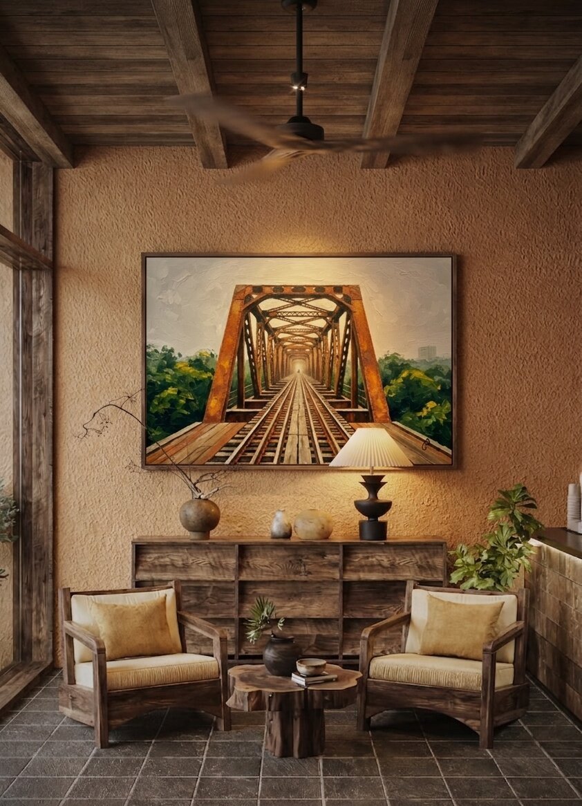 Welcome the historic endurance and solitary beauty of Hanoi into your living space. This mesmerizing Long Bien Bridge Painting offers a breathtaking, perfectly symmetrical perspective of the capital city’s most iconic architectural landmark. It serves as a striking visual centerpiece that will immediately add urban character, rich history, and incredible texture to your interior decor.